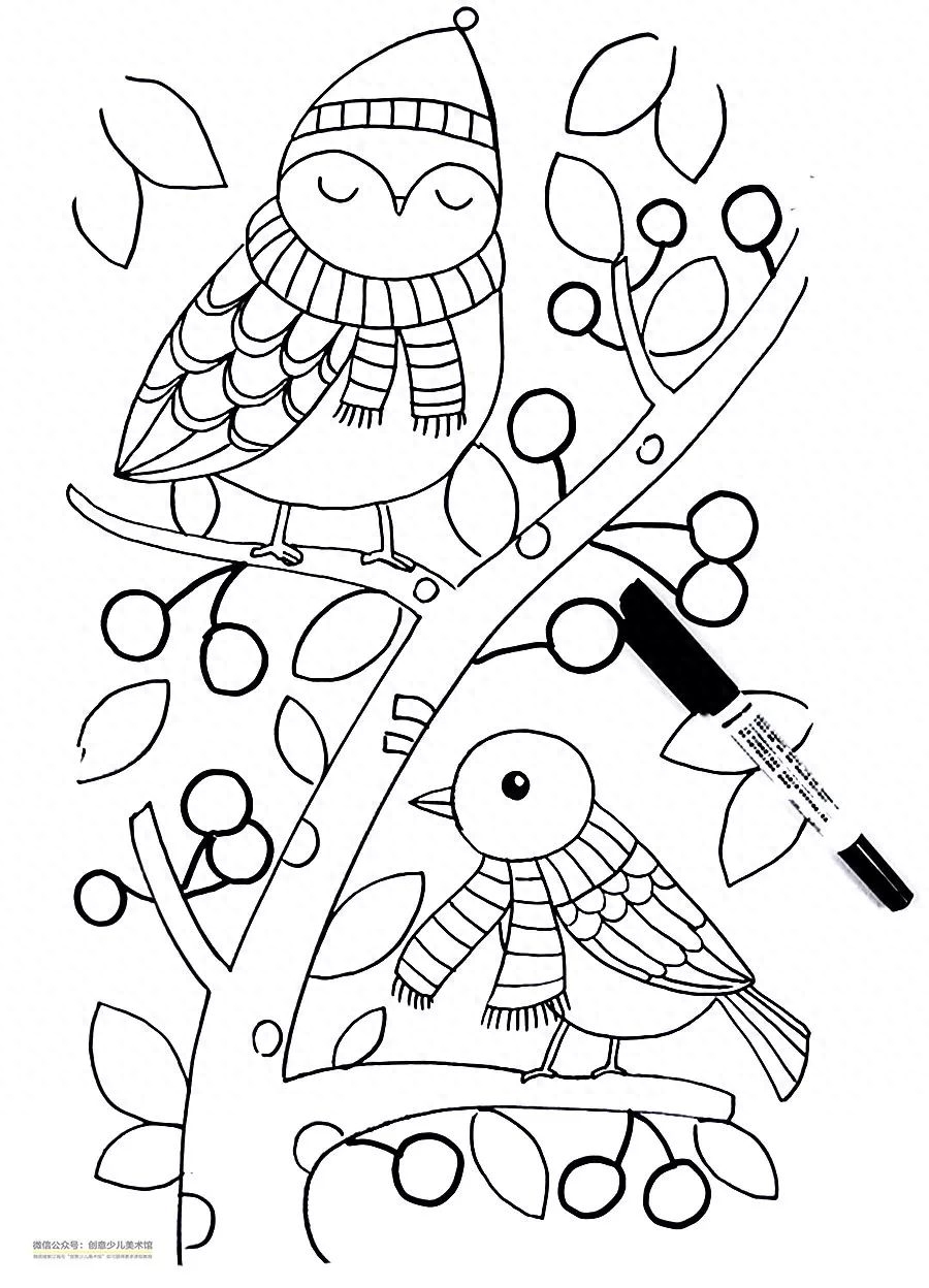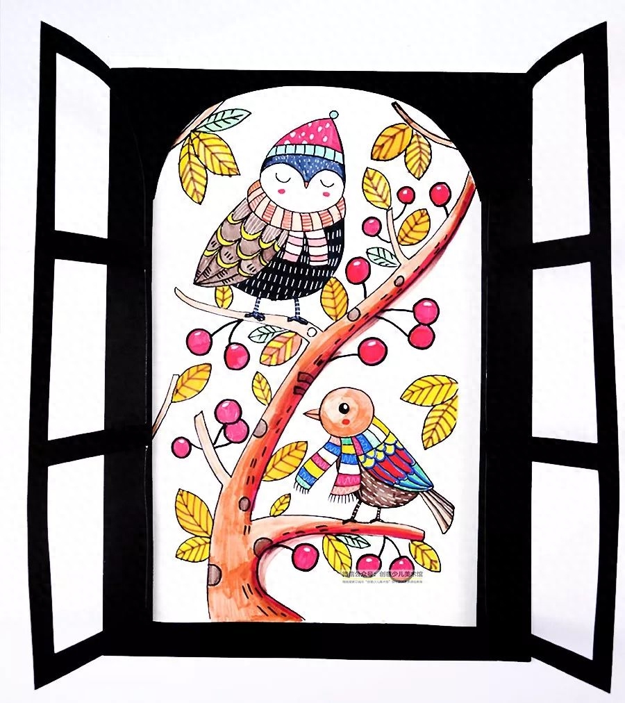 窗外的风景可真美啊!一根根树枝穿过窗户前面,茂盛的树叶渐渐的变得稀少,原来的绿色衣裳悄悄的变得颜色丰富起来,红的黄的橙的披在身上美丽极了;红彤彤的果子挂满了枝头,香甜的果香在风中弥漫,吸引了小鸟飞过来,轻轻的落在树枝上,准备享受一顿美食。天气太冷了,小鸟都忍不住戴上了帽子、围巾、穿上厚厚的棉袄来温暖自己。今天我们就来画一画窗外美丽的风景吧。