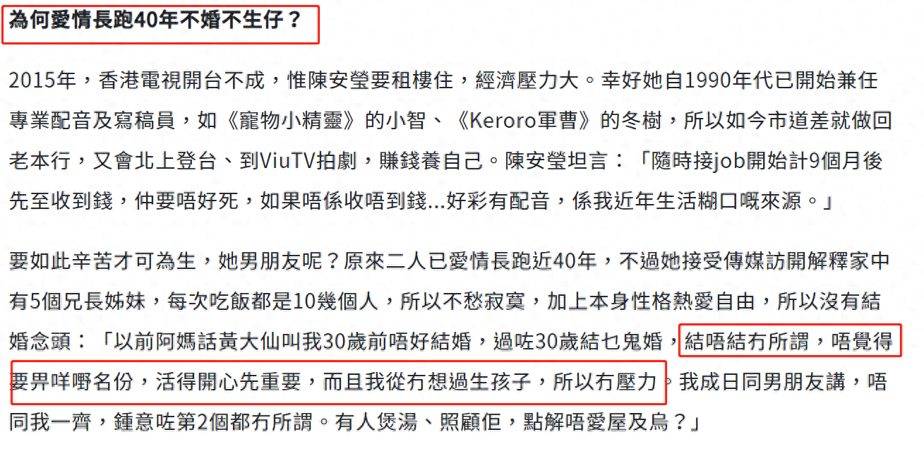 事业起起落落的陈安莹,感情生活十分的简单平淡。据她本人透露,她有个爱情长跑了40年的男友,但两人一直没打算结婚,始终也始终坚持不育。