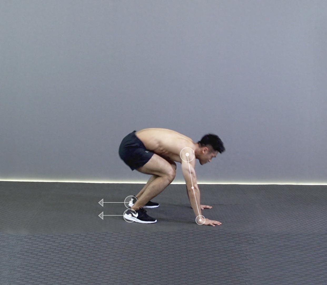 适当的停顿之后,双脚需要像青蛙跳一样向前跳出,这个时候双手需要发力,让你的上半身向上推起,回到刚开始的准备姿势。