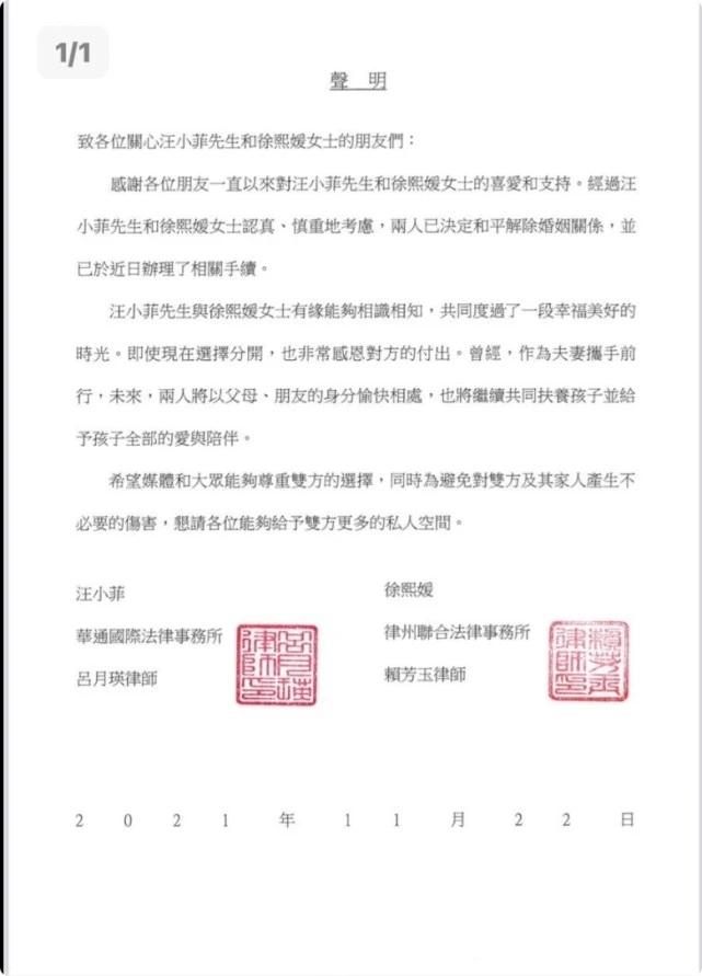 2021年11月22日大S宣布和汪小菲离婚