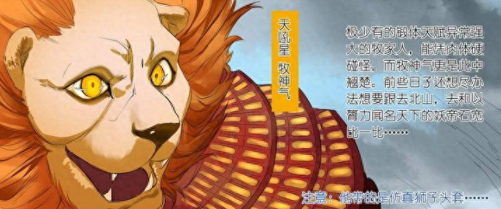 牧神气刚出场时我还以为这是哪里蹦出来的妖怪,后来才得知人家只是戴了个仿真的狮子头套,牧家主修体魄,也是人族中少有的能够用身体对抗妖怪的家族,所以可以推测出牧家人天生神力,并且拥有能提升人体素质的修炼功法,但毕竟是人身,再强悍也比不过更强大的妖怪,潜力有限。