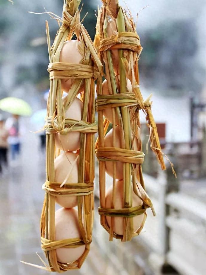 这其实是当地老乡为了让买主能方便携带而且还可以保护鸡蛋而想出的办法,用麦草等编一个蛋壳框,一般10个为一串。但是这种情况当下其实已经很难见到,现在已经有更好的办法来保护鸡蛋,这样的卖法已经逐渐消失。