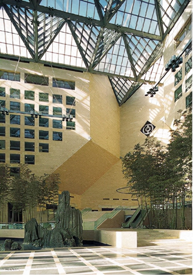 面对四周长有100多米的中银总部大厦,除了笨重外,采光也有问题,这就对空间形式的处理有了更高的要求。贝聿铭的解决方法是在室内建一个园林。