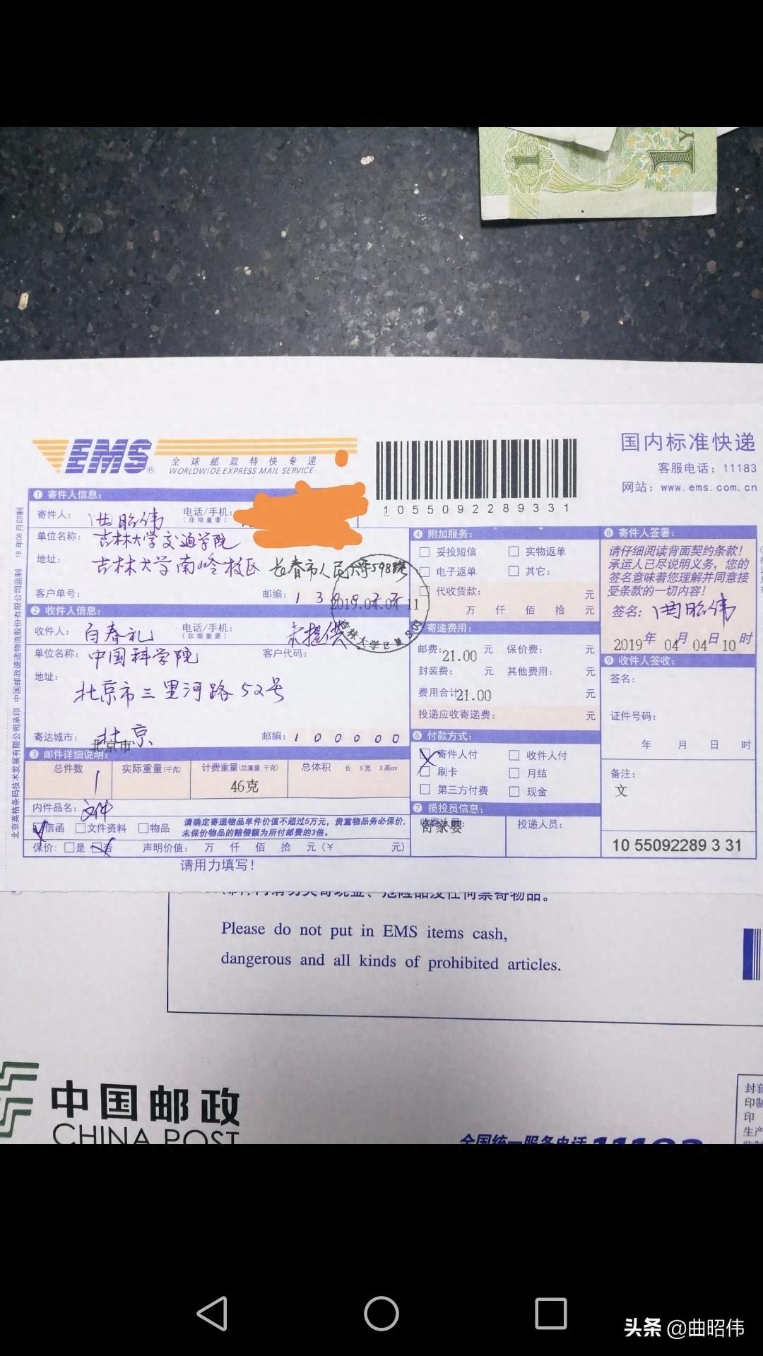 吉林大学教授曲昭伟2019年4月4日写了一封信给中国科学院,实名指出中科院院士潘建伟的量子科技“所做的一切和量子无关”,“分明是在忽悠我们”。信后附有信的影印件和寄信的EMS信封图片。信的全文如下: