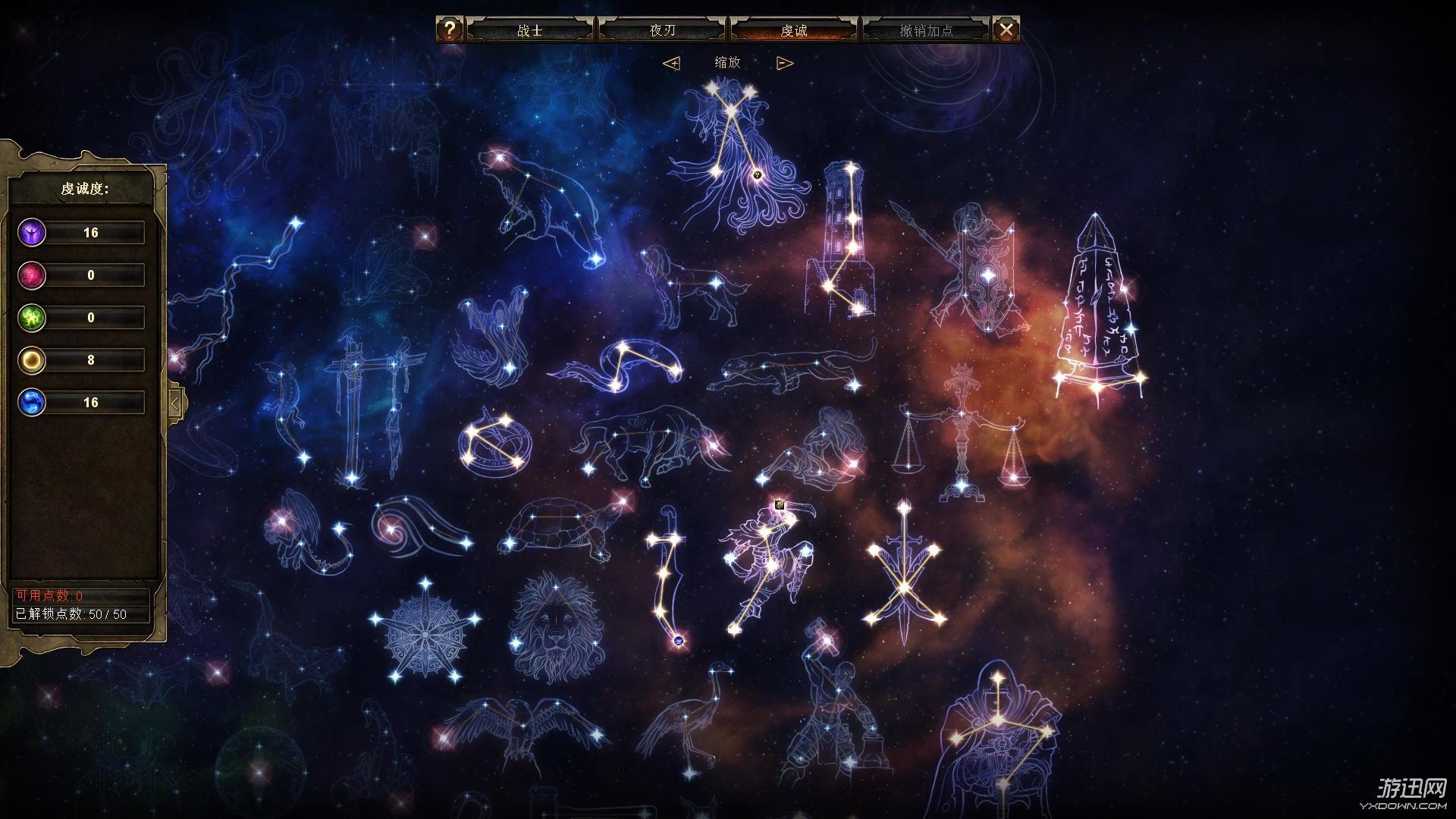 20-50级,从第2关到通关的级别,闪电新星开始吃力了,不过还好夜刃技能快点满了,处决,死亡旋风,瞬影都点满,25级时去第二关走私通道刷紫名巨人出个迷雾护符图纸,合成装备上,把左键设为巨魔之怒,然后点着左键打怪,这时DPS提升2-3倍,怪基本是秒过去。夜刃技能都加好后再开战士吧,战士优先点满专精,然后按5楼的图加就差不多了。星座方面先加老鹰,绑定巨魔之怒,清怪超快,以后出了刺客就可以把老鹰洗掉,用刺客的技能了,360度放针,全屏AOE!!!