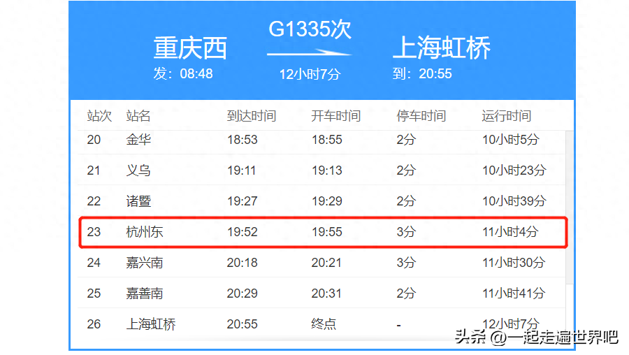 从图中不难看出,高铁列车从重庆西站发车,到杭州东站,也需要11个小时。