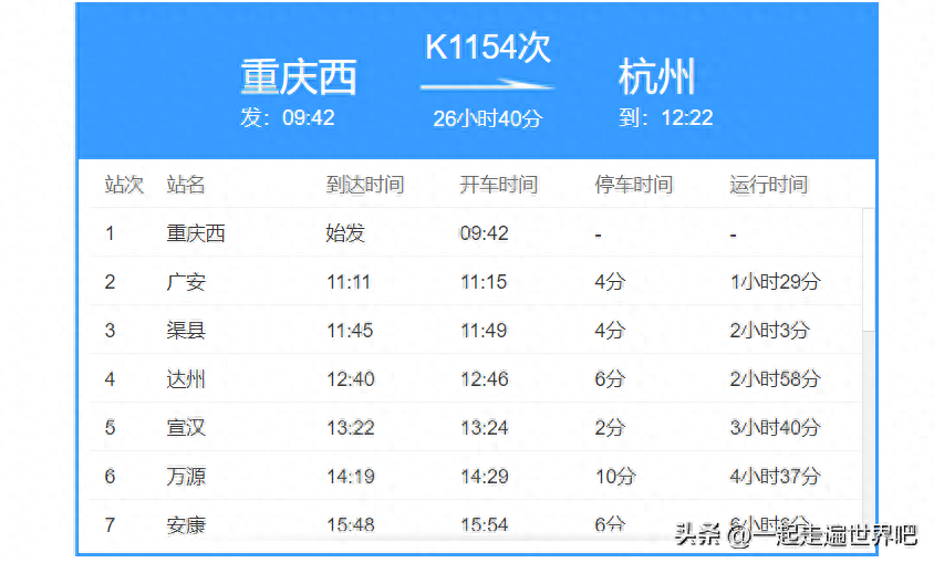 从图中,我们不难看出,这是一趟从重庆西站始发,终到杭州站的列车。