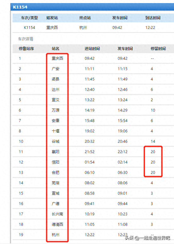 K1154次旅客列车,全程一共设置了19个站点,分别为:重庆西站、广安站、渠县站、达州站、宣汉站、万源站、安康站、十堰站、谷城站、襄阳站、信阳站、合肥站、芜湖站、宣城站、广德站、长兴南站、德清西站、杭州站!