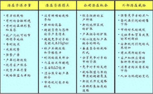 把识别出的所有优势分成两组,分的时候以两个原则为基础:它们是与行业中潜在的机会有关,还是与潜在的威胁有关。用同样的办法把所有的劣势分成两组,一组与机会有关,另一组与威胁有关。
