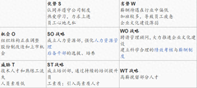 SWOT矩阵能帮助企业的经理们识别和制定四种战略:SO战略(优势一机会战略)、WO战略(劣势一机会战略)、ST战略(优势一威胁战略)和wT战略(弱势一威胁战略)。规划企业SWOT分析最难之处就在于将外部环境和内部条件结合起来分析,这不仅仅需要扎实的理论功底和丰富的实践经验,还需要战略的直觉判断且不遵循固定模式。