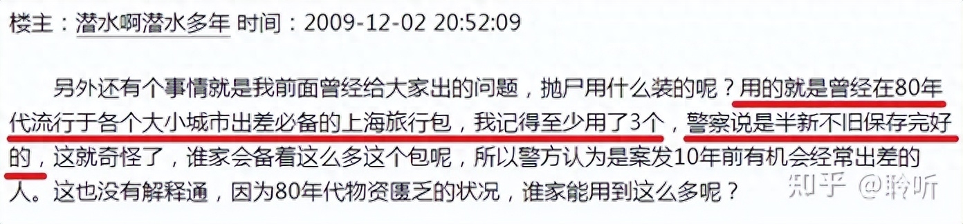 先不说凶手是怎么将尸块抛在水佐岗,这种离南大较远的地方的?大家先看一下凶手有什么,来判断一下——他的经济条件:我们知道,凶手是有炊具、有厨具,很可能还有冰柜或冰箱的物品,就意味着他是有住房条件的。其次,大家再认真地了解一下,凶手抛尸用的那三个包:牛仔大背包、人造革旅行包、仿牛筋旅行包——在那个品牌还没有兴起的年代,质量就代表着价值,以这三个包的材质来分析:在那个年代,这三个包的价格绝对不会便宜的!所以,凶手怎么会买不起自行车呢?