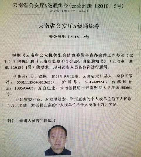 蒋兆岗的出逃让办案机关大为震惊!云南省公安厅5月10日发布通缉西南林业大学校长蒋兆岗的A级通缉令。通缉令公布了蒋兆岗的身份证号码、护照号码和大陆居民往来台湾地区通行证号码。通缉令同时宣布,经省监察委同意,对发现线索、举报查实的个人或单位,奖励人民币5万元;对抓捕归案的个人或单位,奖励人民币10万元。