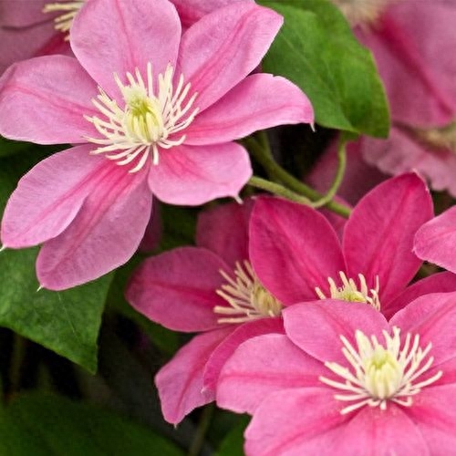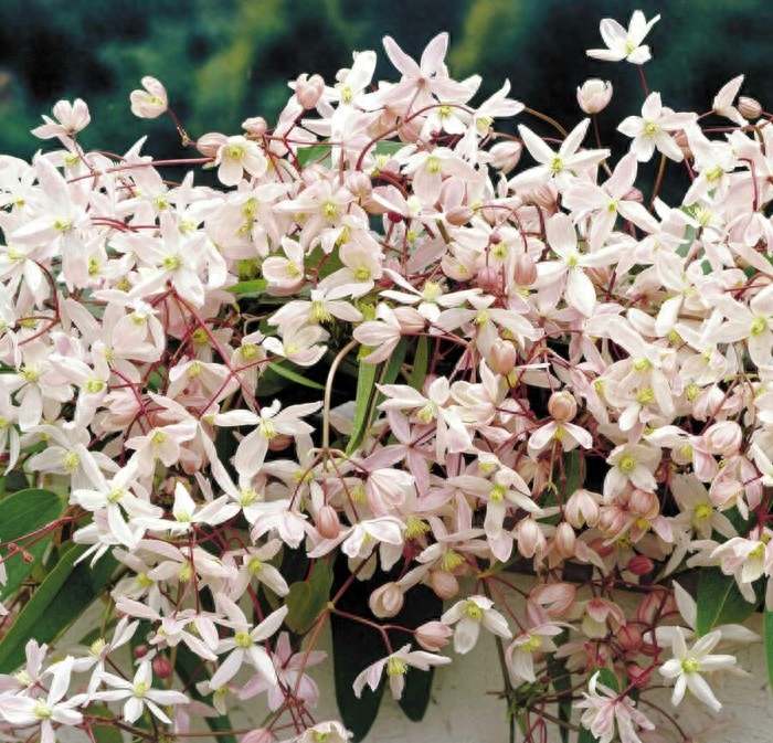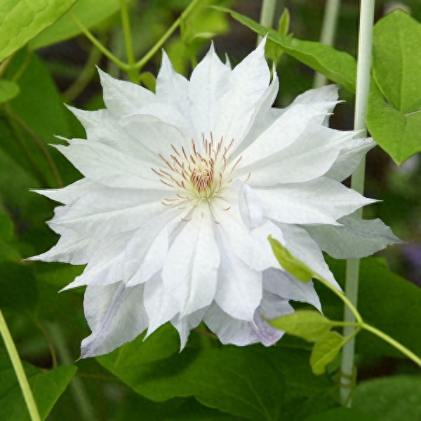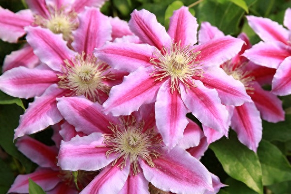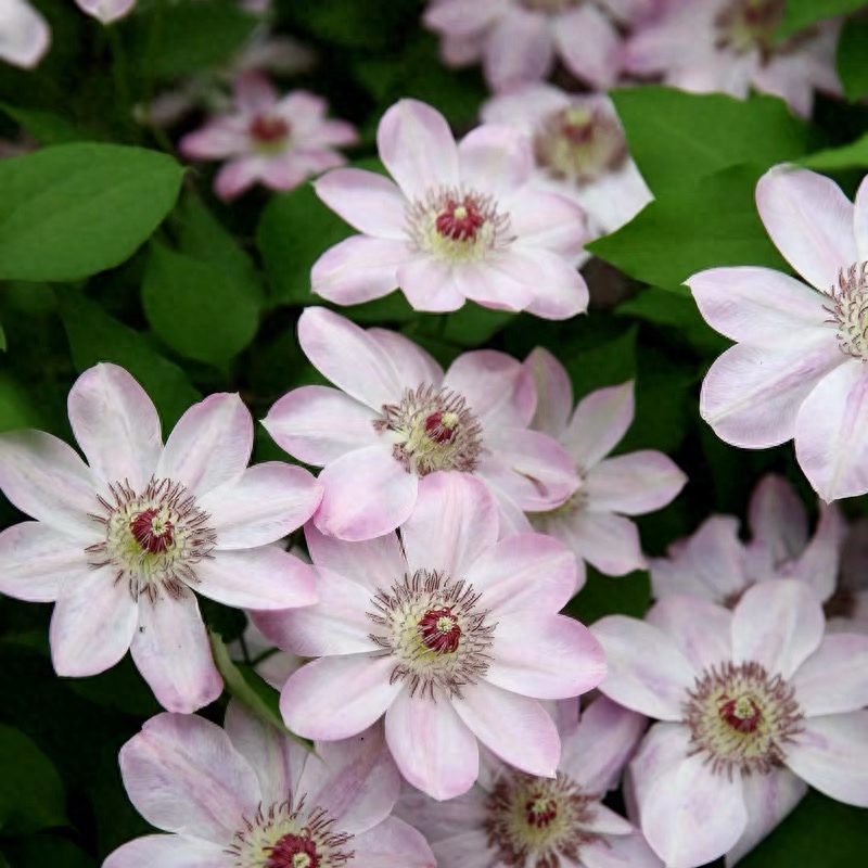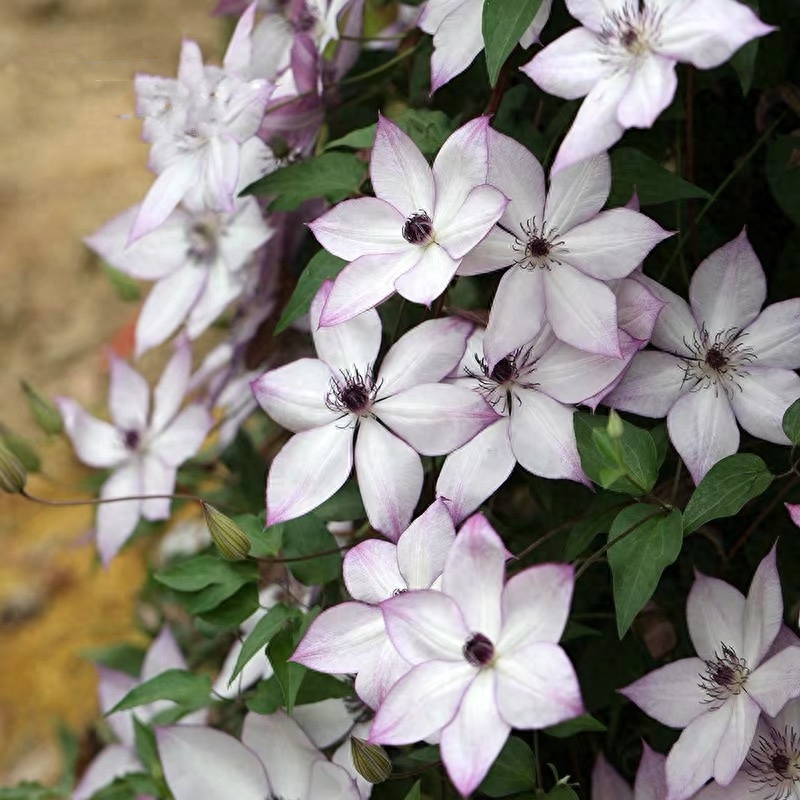 单瓣,白色花瓣上带有粉红色的条纹(条纹从中线开始向外发散)。经典铁线莲品种,号称铁线莲之王,花期长、花量大。