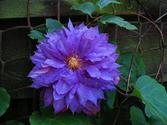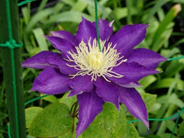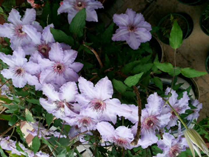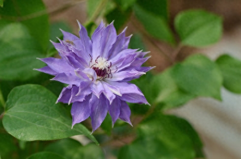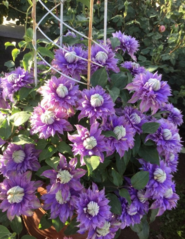 重瓣,花色蓝色稍泛白,植株通过叶柄缠绕攀爬在篱笆上、花架上。花期早且长。