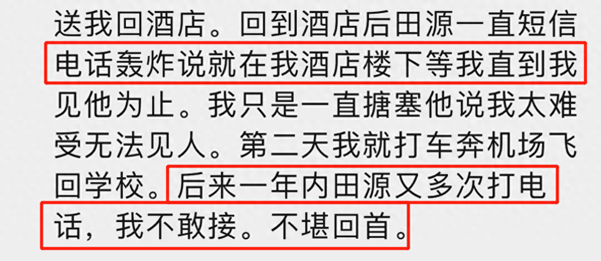 后来田源不断发短信、打电话要求Anna下楼与自己见面,她只能找借口说身体太难受,无法见人。隔天她迅速坐飞机回学校,面对田源长达一年的电话骚扰,完全不敢理会。