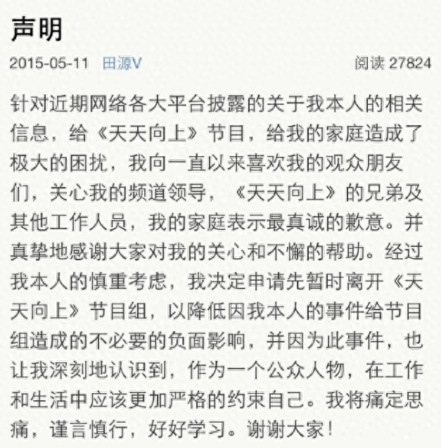 “实锤”之下,田源发声明表示要暂时离开《天天向上》,对不起观众、领导、兄弟以及家庭。