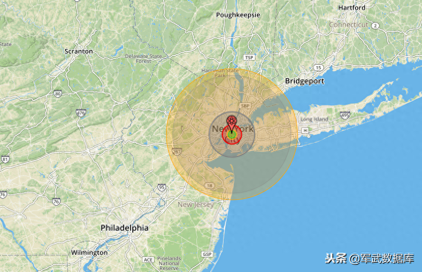 一枚沙皇炸弹如果在纽约爆炸,那么影响的范围可以如图所示: