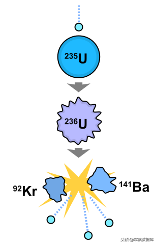 主要来自于质量的损失——在一个铀-235原子吸收了一个中子以后会变成一个铀-236原子,同时会释放出6.4兆电子伏特的结合能。这个能量大于铀-236的裂变势垒。于是铀-236原子内部的能量过大导致铀-236快速的释放出三个中子以及一个氪92原子和一个钡141原子,同时释放出2兆电子伏特的能量。