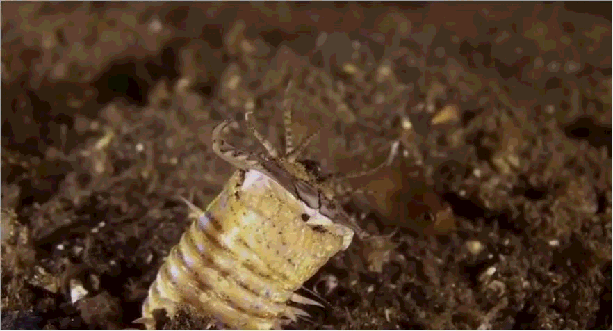 有陷阱就要有诱饵,博比特虫的诱饵就是它自己用来感知猎物的五根触须以及浑身五彩斑斓的外壳。这五根触须不仅形似小蠕虫,而且在水中不断地摆动时,还能够感知周围的水流情况,一旦发现有其他的鱼类靠近,立马用剪刀般的口器将其钳住,拖入深不见底的沙坑当中。