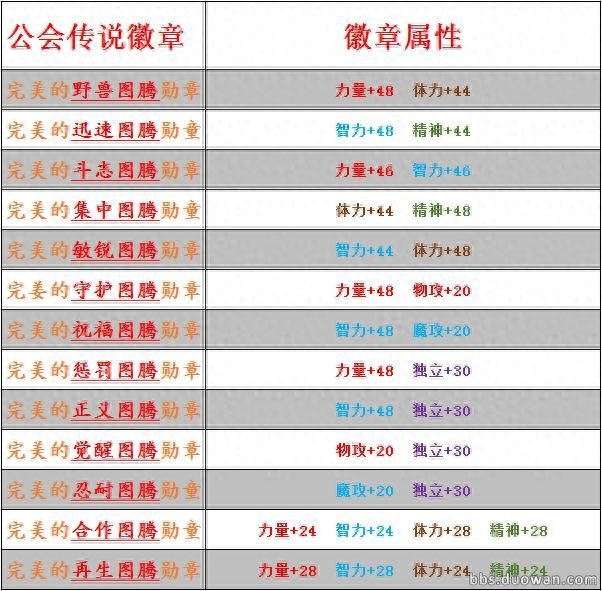 首先就是勋章,勋章有白色蓝色紫色粉丝和传说属性的话也是递增的,白色的属性6点力量智力精神体力的随机两种。