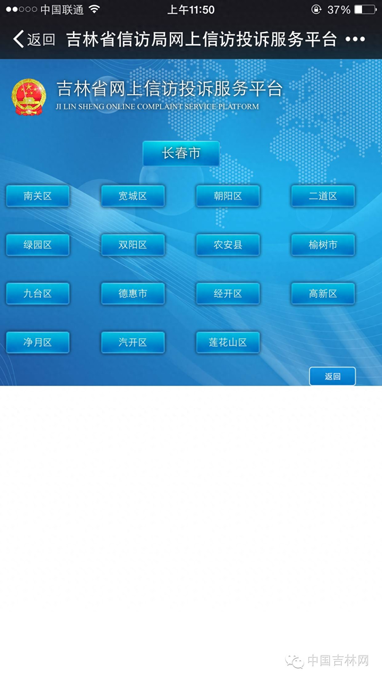 也可关注长春市信访局的微信公众号(“长春信访”或“ccxf”),通过微信反映问题。向所在县(市、区)党委、政府反映信访问题或查询办理情况,可通过所在地政府信息港,登录到所在县(市、区)、开发区信访工作部门的门户网。