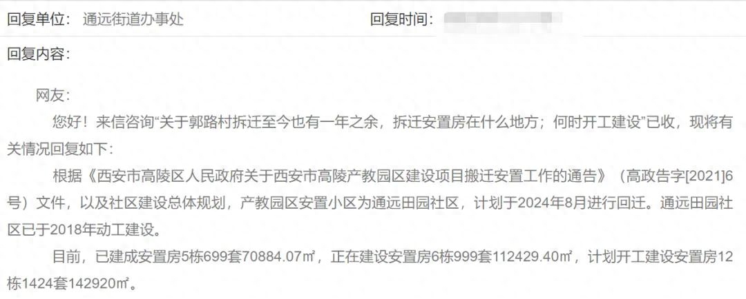 答:根据《西安市高陵区人民政府关于西安市高陵产教园区建设项目搬迁安置工作的通告文件,以及社区建设总体规划,产教园区安置小区为通远田园社区,计划于2024年8月进行回迁。通远田园社区已于2018年动工建设。