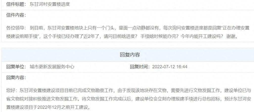 待文物发掘工作完成以后,建设单位会立刻办理报建手续进行总包招标,预计东甘河安置楼建设项目于2022年12月之前开工建设。