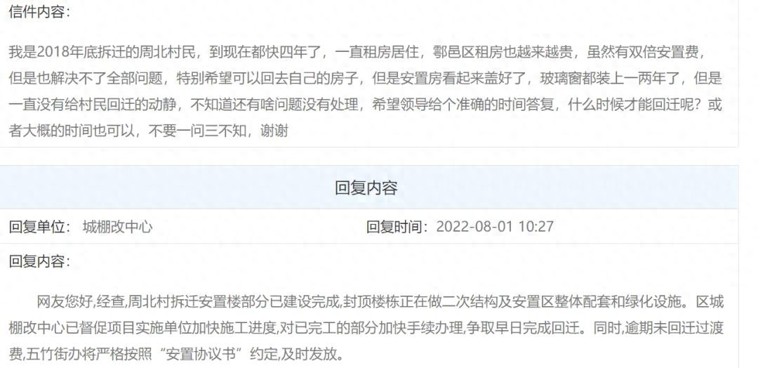 答:周北村拆迁安置楼部分已建设完成,封顶楼栋正在做二次结构及安置区整体配套和绿化设施,区城棚改中心已督促项目实施单位加快施工进度,对已完工的部分加快手续办理,争取早日完成回迁。