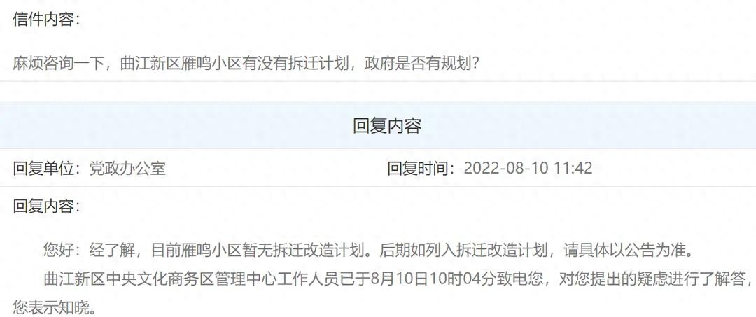 问:曲江新区雁鸣小区有没有拆迁计划,政府是否有规划?
