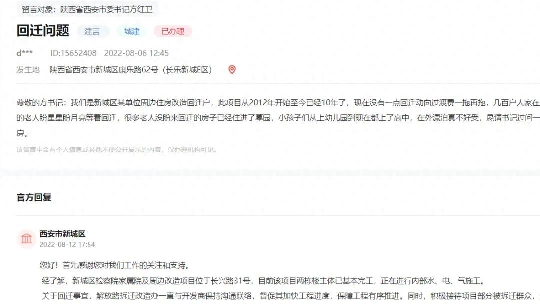 问:新城区检察院家属院及周边改造项目回迁进度?