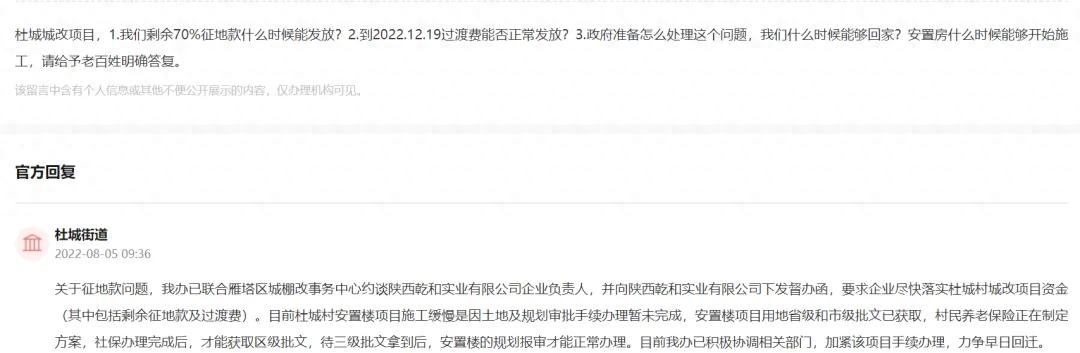 答:目前杜城村安置楼项目施工缓慢是因土地及规划审批手续办理暂未完成,安置楼项目用地省级和市级批文已获取,村民养老保险正在制定方案,社保办理完成后,才能获取区级批文,待三级批文拿到后,安置楼的规划报审才能正常办理。