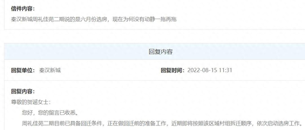 答:周礼佳苑二期目前已具备回迁条件,正在做回迁前的准备工作,近期即将按照该区域村组拆迁顺序,依次启动选房工作。