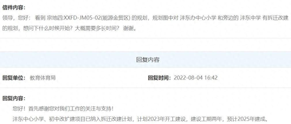 答:沣东中心小学、初中改扩建项目已纳入拆迁改建计划,计划2023年开工建设,建设工期两年,预计2025年建成。