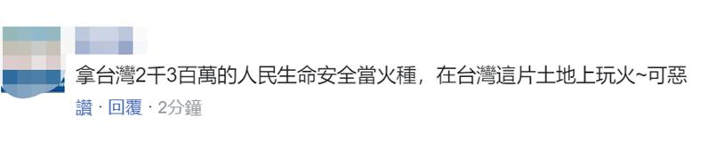 对于佩洛西坚持访台,有岛内网友表示:她拿台湾 2300 万的人民生命安全当火种,在台湾这片土地上玩火,可恶。↓