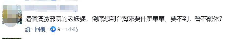 还有网友说:" 这个满脸邪气的老妖婆,到底想到台湾来要什么东东,要不到,誓不罢休?" ↓