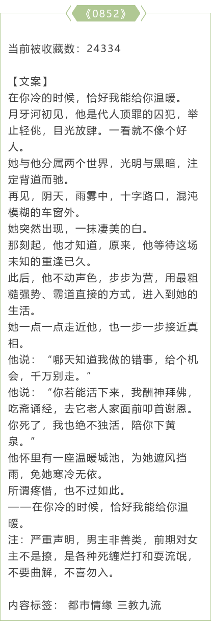 男主替人定罪坐过牢,代号0852。女主非处,未婚夫出轨,虽长的很小白兔但脑子不小白。