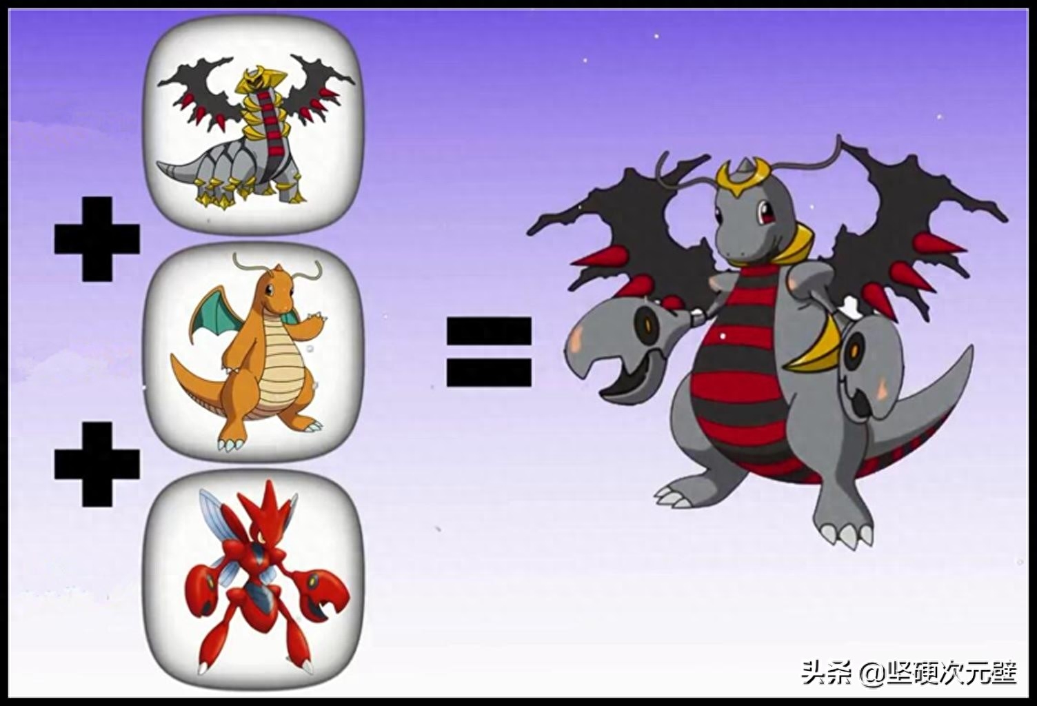骑拉帝纳是传说宝可梦,它是冥王龙,栖息在毁坏的世界,是破坏的代名词;快龙是“半神”宝可梦之一,有着非常快速的飞行速度,是很多小伙伴喜欢的宝可梦;巨钳螳螂虽然有着两对翅膀,但因为身体太重,所以几乎无法飞行。当骑拉帝纳、快龙、巨钳螳螂“合体进化”后,看上去又萌又可怕,顶着快龙的头看上去萌萌哒,但浑身灰、黑、红配色,看上去又十分危险。
