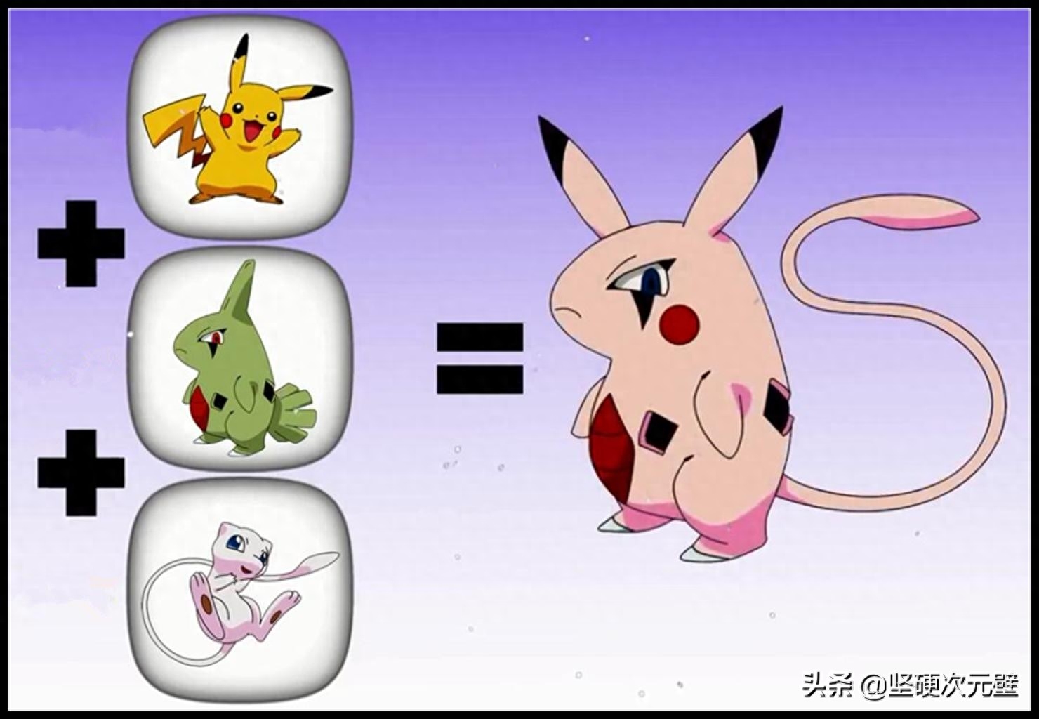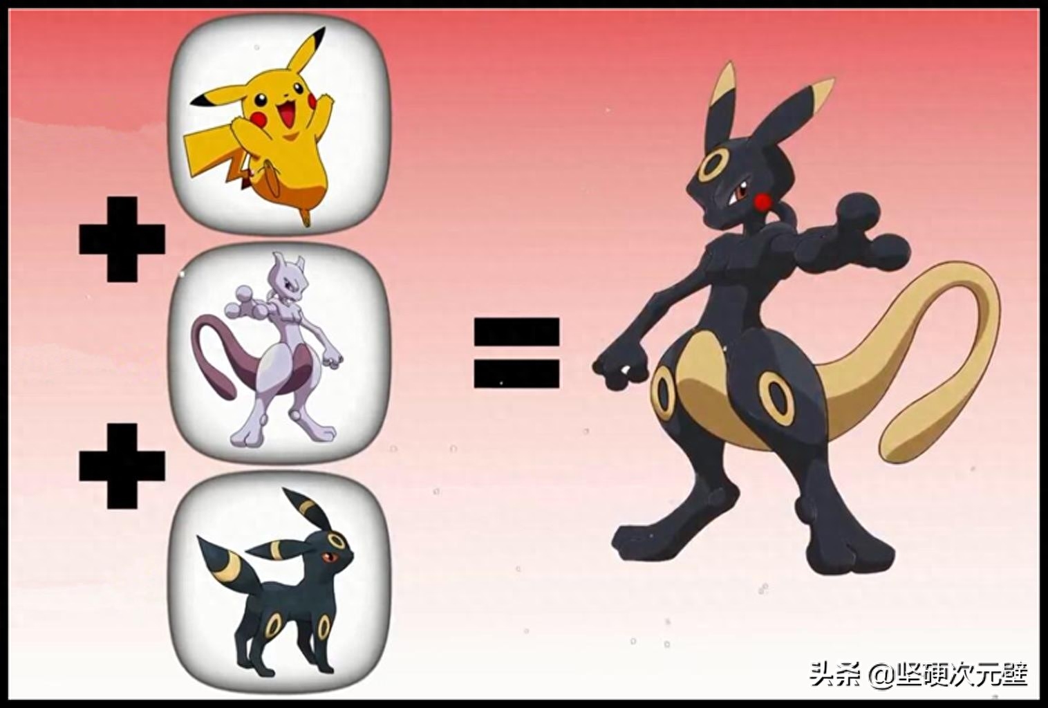 皮卡丘是所有宝可梦中人气最高的一个,凭借着可爱的外形俘获了万千少男、少女的心;超梦则是利用梦幻基因重组认为制造出来的宝可梦,战力惊人,但却有着非常暴躁不稳定的情绪;月亮伊布则是伊布在特定环境下进化形态,也非常受欢迎。当皮卡丘、超梦、月亮伊布“合体进化”后,以超梦为原型,有着黑色的皮肤,黄色的尾巴,还有着皮卡丘一样的耳朵和腮红,看上去可爱有强势!