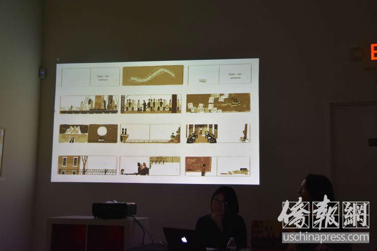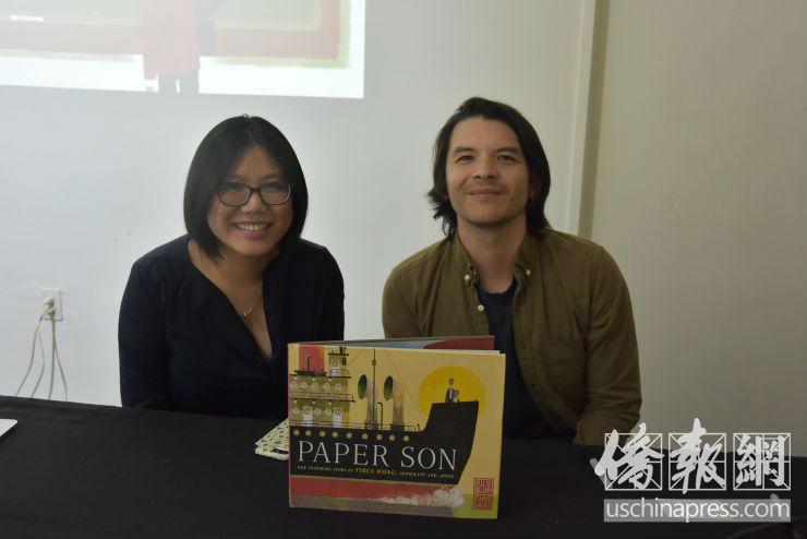 作家梁朱莉(Julie Leung)和插画家萨萨基(Chris Sasaki)介绍黄齐耀。侨报记者李青蔚摄
