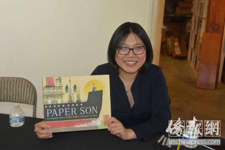 作家梁朱莉(Julie Leung)和图画书《契约儿子》(Paper Son)。侨报记者李青蔚摄