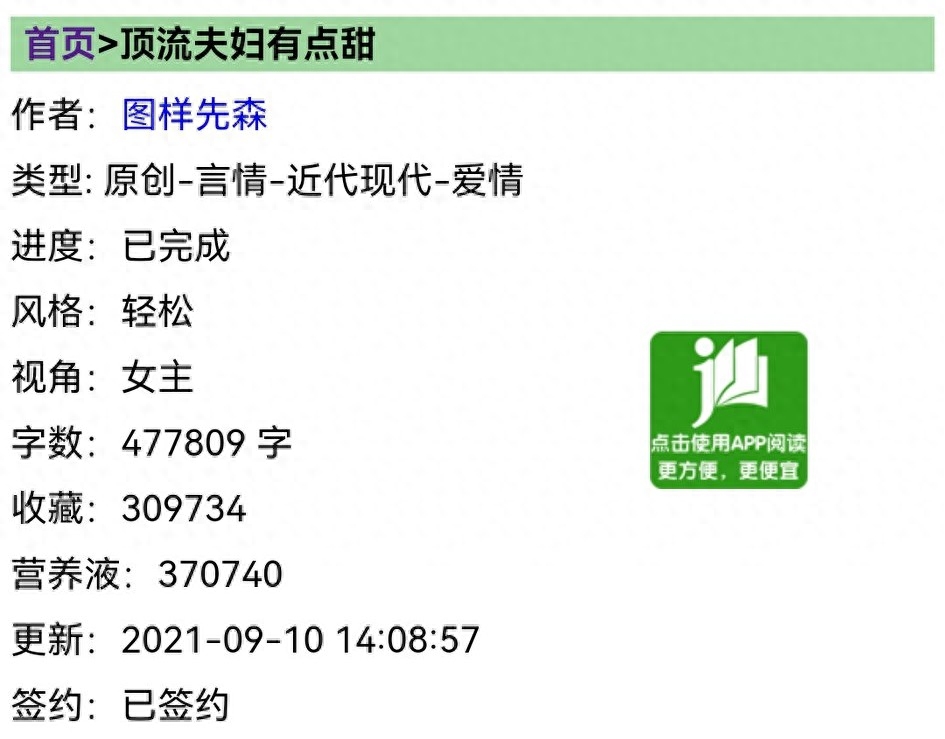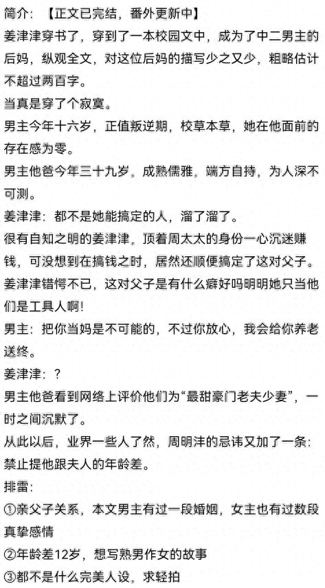 书评:五星推荐。最甜豪门老夫少妻,三十九岁的男主和二十七岁的女主,男主还有一个十六岁的儿子。不同于大多数的继母文章,女主和继子之间更像朋友,两个人的互动很友爱。这个作者的小说一般是立意新颖,但是文笔不足,所以有时候显得不够吸引读者,而这一篇是难得的我能完整看完的小说。冷静自持的男主和乐观活泼的财迷女主,超甜!