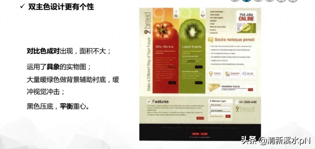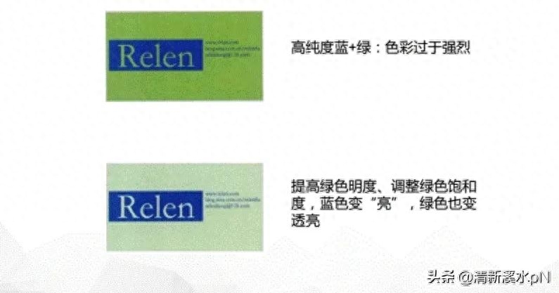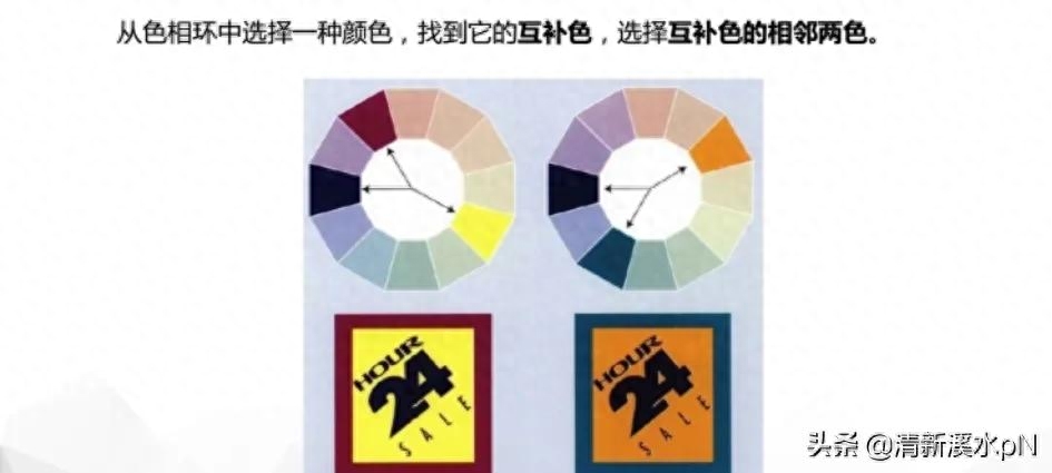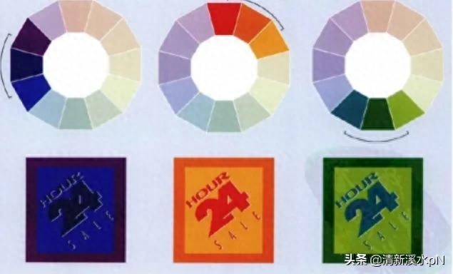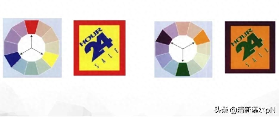 相邻两色的搭配简单有效,需调整明度和纯度,一种颜色纯度高时,另一种纯度或明度要低;