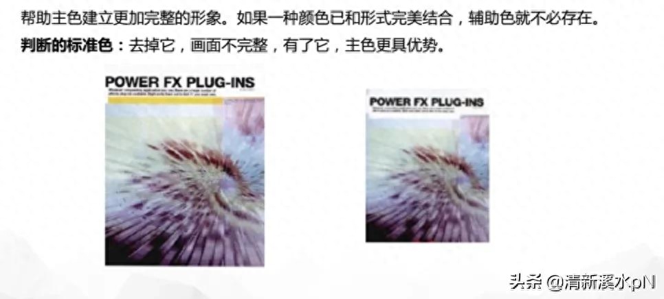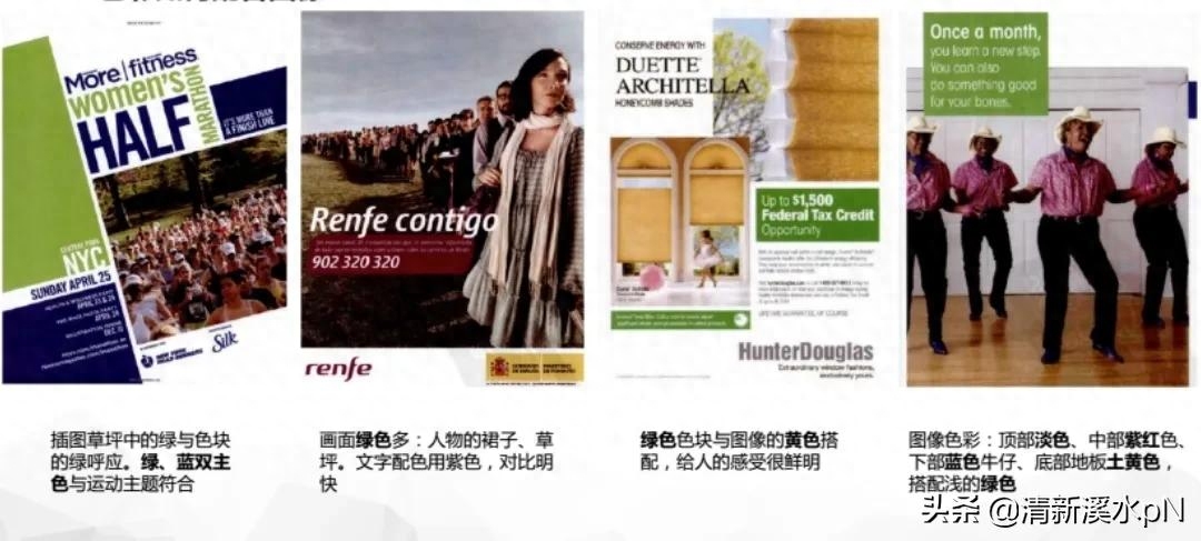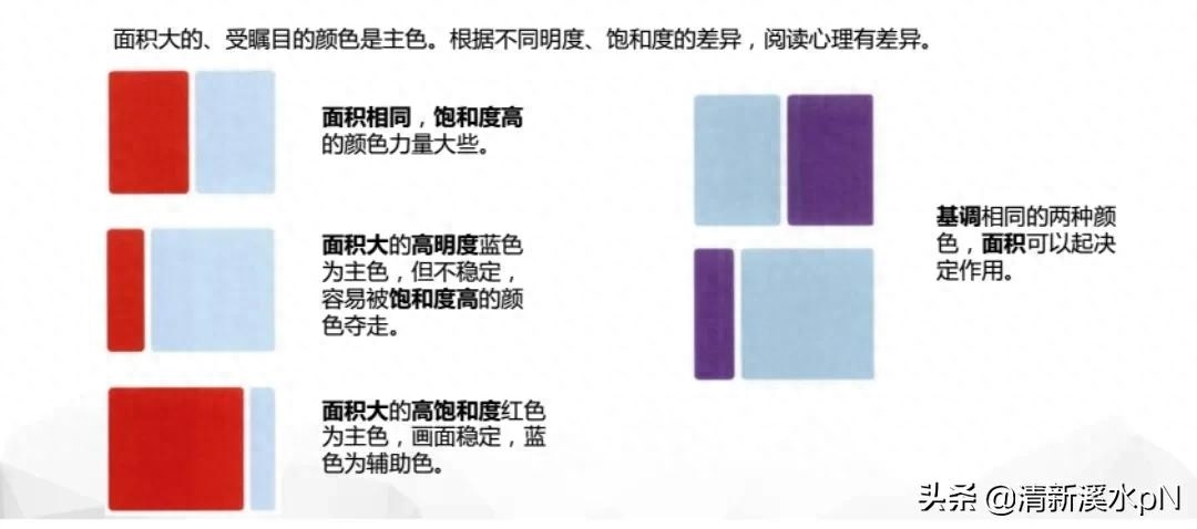 主色的面积原理:主色应该面积大且饱和度高。面积相同,饱和度高的颜色为主色;基调相同面积大的为主色;面积大的高明度颜色为主色不稳定,容易被饱和度高的颜色夺走;画面视觉中心的颜色成为主色;户外广告的背景色成为主色。