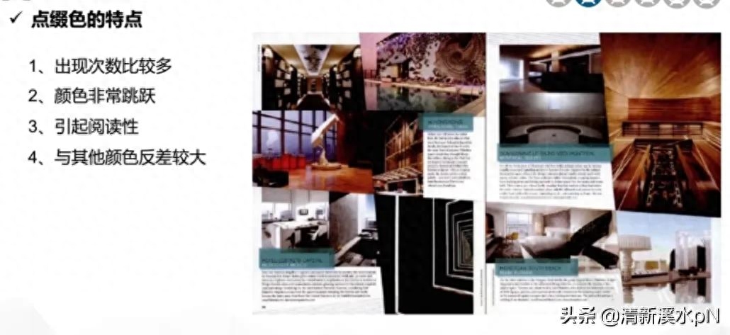 通常体现在细节上,多数是分散的,与其他颜色反差较大,面积比较小。