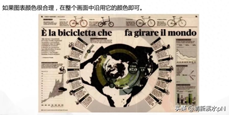 色彩的明度、饱和度尽量相同,采用对比色或间隔色;图表色彩与版式色彩的协调统一。