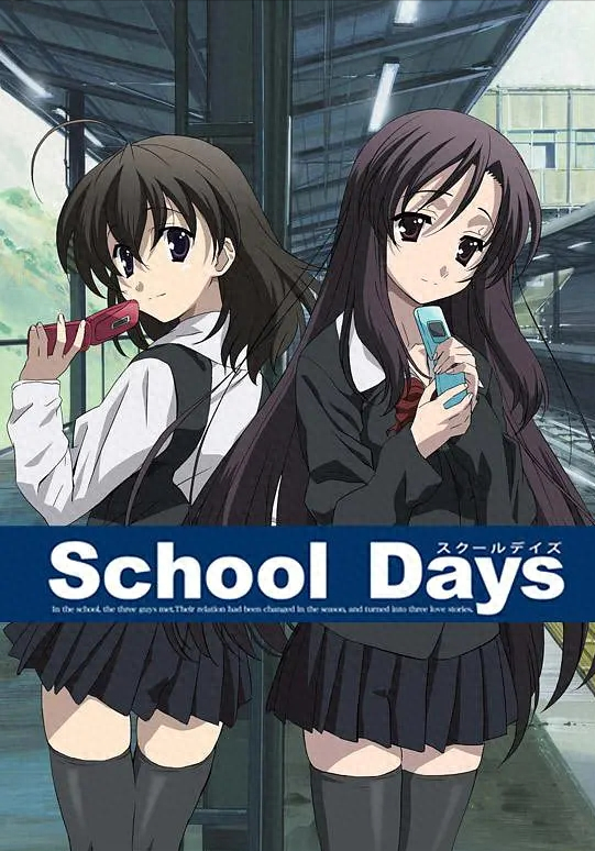 作品介绍:电视动画《日在校园》(又名School Days),是根据0verflow同名游戏改编的动画作品,于2007年7月12日在AT-X开始播放,全12话;OVA于2008年1月17日发售。 本作的主人公伊藤诚突然发现隔壁班的少女桂言叶从第二学期开始和自己乘坐同一辆电车上下学,从此伊藤诚一直注意着她,觉得站在远处望着她心情就会变得好起来。由于学校里流传着“把喜欢的人照片放在待机画面三周不被发现,就会获得圆满的爱情”的传说,伊藤诚便将在电车上拍到的桂言叶照片放在了待机画面,但却在第一天就被同桌西园寺世界发现了,西园寺世界为了赔礼道歉,决定支援两人撮合的事情,由此引发了三人之间一系列的情感纠葛。