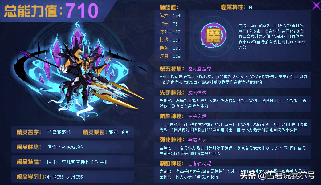 属性也是为了表示和布莱克是同族采用的暗影系,机制完全没有魔界那么强力,基本也就一个属性概率害怕能入眼。入手方式上,参加14年活动魔灵王的激变,通过3个关卡即可将小形态进阶,总体难度当年还不算太阴间,算是较为平民的一个精灵了,可惜强度也是够呛。