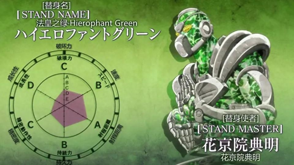 替身绿色法皇(Hierophant Green),由绳状物构成人型外观,也可编织成结界,依附人体可控制意志,可喷射宝石状的体液作强力穿刺攻击。但是伸出的线条受到伤害本体也会受到伤害,准确的说法皇之绿并不是产生线条而是替身本体伸展开来。名字对应塔罗牌大阿卡娜牌中的五号牌“教皇(The Hierophant)”。
