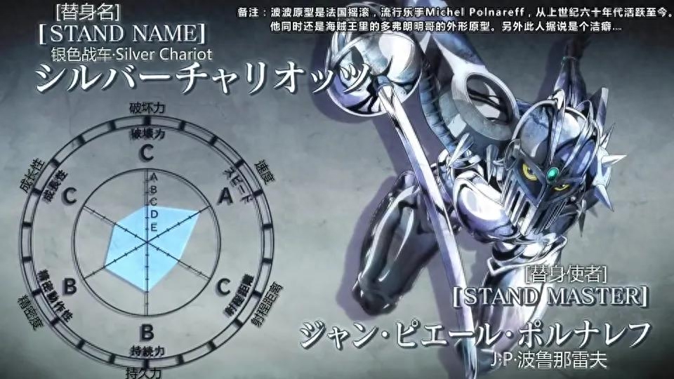 替身银色战车(Silver Chariot),利用手中的双刃西洋剑进行攻击。其攻击速度极快,甚至可以通过快速挥剑分隔开空气,可以借此“斩断”火焰。名字对应塔罗牌大阿卡娜牌七号牌“战车(The Chariot)”