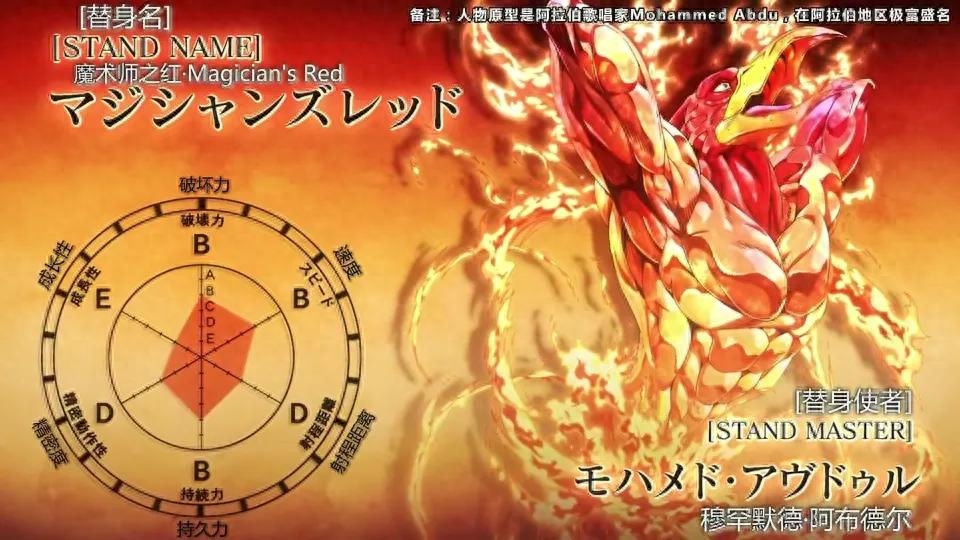 替身红色魔术师(Magician's Red)鸟人外型,具有控制火焰与热的能力,性能普通,缺乏白金之星和银色战车的爆发力与绿色法皇的控场水准,但因其大范围火焰操控的原因,其覆盖、应变和持久战实力在五人之中最为出众。而本人的作战风格属于稳扎稳打型,所以红色魔术师的作战效果不像其他三人那样具有侵略性。名字对应塔罗牌大阿卡娜牌中的一号牌“魔术师(The Magician)”
